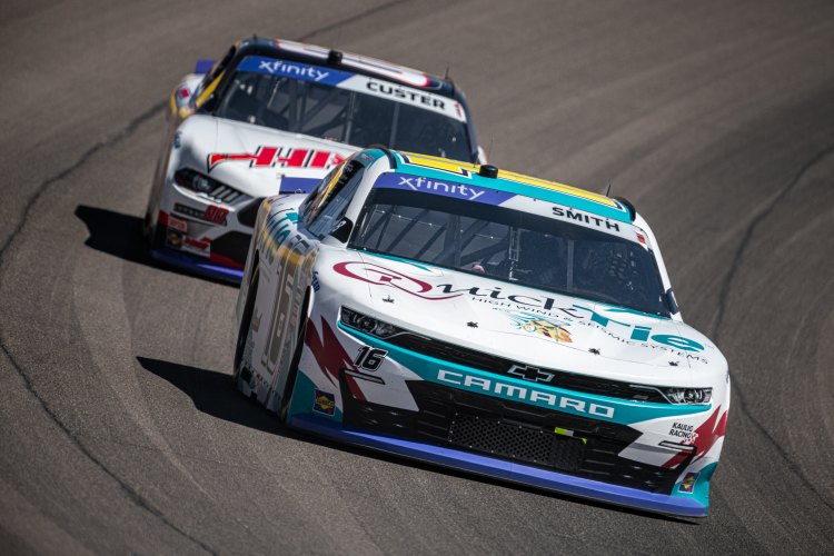 LAS VEGAS, NEVADA – OCTOBER 14: Chandler Smith, driver of the #16 Barger Precast/Quick Tie Products Inc Chevrolet, and Cole Custer, driver of the #00 Haas Automation Ford, race during the NASCAR Xfinity Series Alsco Uniforms 302 at Las Vegas Motor Speedway on October 14, 2023 in Las Vegas, Nevada.