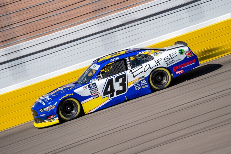 LAS VEGAS, NEVADA – OCTOBER 14: Ryan Ellis, driver of the #43 Eclipse Claims Consulting Ford, races during the NASCAR Xfinity Series Alsco Uniforms 302 at Las Vegas Motor Speedway on October 14, 2023 in Las Vegas, Nevada.