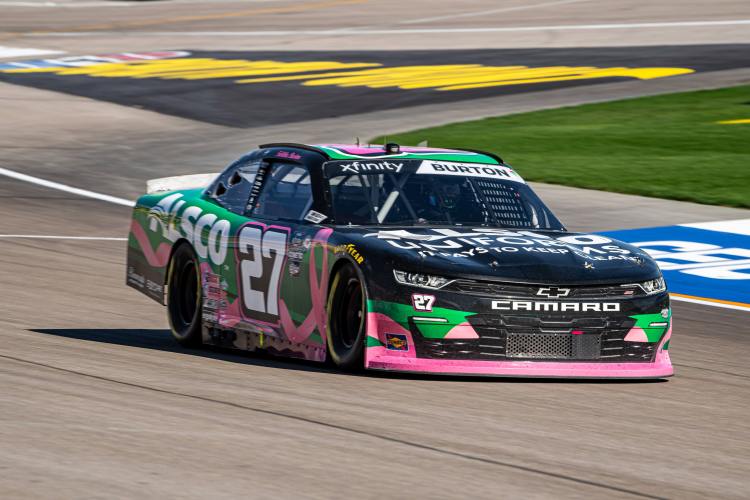 LAS VEGAS, NEVADA – OCTOBER 14: Jeb Burton, driver of the #27 Alsco Uniforms Chevrolet, races during the NASCAR Xfinity Series Alsco Uniforms 302 at Las Vegas Motor Speedway on October 14, 2023 in Las Vegas, Nevada.