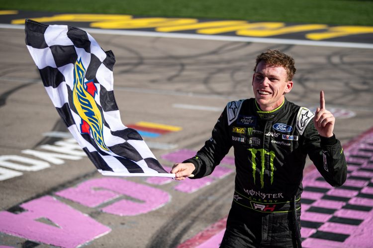 LAS VEGAS, NEVADA – OCTOBER 14: Riley Herbst, driver of the #98 Monster Energy Ford, celebrates with the checkered flag after winning the NASCAR Xfinity Series Alsco Uniforms 302 at Las Vegas Motor Speedway on October 14, 2023 in Las Vegas, Nevada.