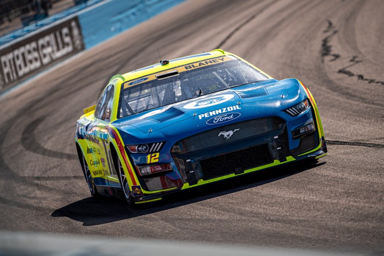 AVONDALE, ARIZONA – NOVEMBER 03: Ryan Blaney, driver of the #12 Menards/Dutch Boy Ford, drives through the garage area during practice for the NASCAR Cup Series Championship at Phoenix Raceway on November 03, 2023 in Avondale, Arizona.