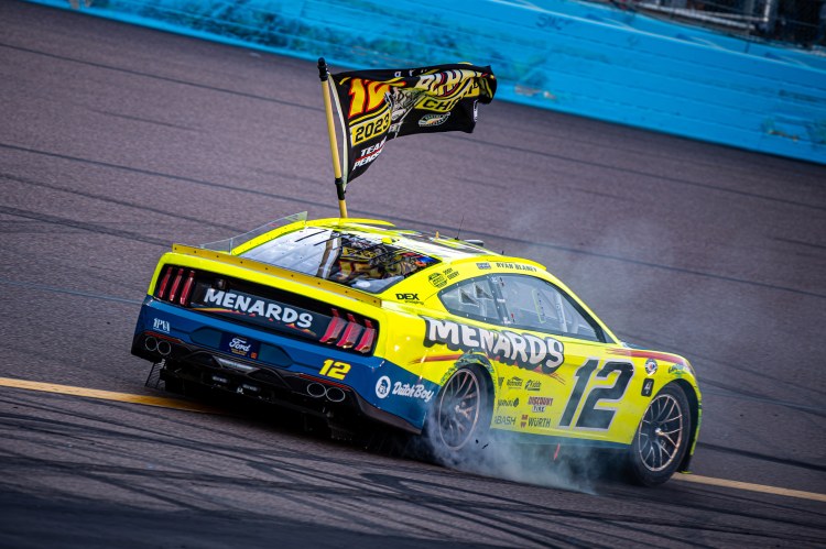 AVONDALE, ARIZONA – NOVEMBER 05: Ryan Blaney, driver of the #12 Menards/Dutch Boy Ford, celebrates with a burnout after winning the 2023 NASCAR Cup Series Championship at Phoenix Raceway on November 05, 2023 in Avondale, Arizona.