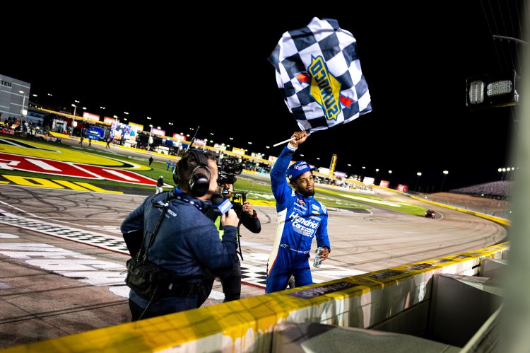 LAS VEGAS, NV – MARCH 01: Rajah Caruth, driver of the #71 Spire Motorsports HendrickCars.com Chevrolet, celebrates with the checkered flag after winning the Victoria’s Voice Foundation 200 presented by Westgate Resorts NASCAR Craftsman Truck Series race on March 1, 2024, at Las Vegas Motor Speedway in Las Vegas, NV.
