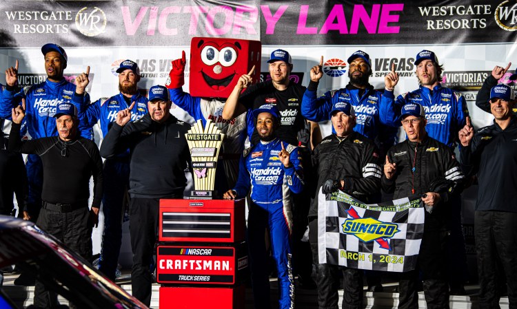 LAS VEGAS, NV – MARCH 01: Rajah Caruth, driver of the #71 Spire Motorsports HendrickCars.com Chevrolet, celebrates in victory lane after winning the Victoria’s Voice Foundation 200 presented by Westgate Resorts NASCAR Craftsman Truck Series race on March 1, 2024, at Las Vegas Motor Speedway in Las Vegas, NV.