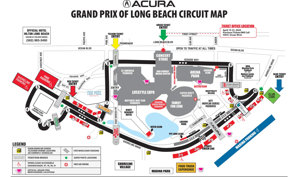 From there, drivers dash down Aquarium Way before meeting up with the Three Dolphins Fountain in from of the Aquarium of the Pacific. After deftly navigating around the fountain, the field will take a pair of tight right handers before re-emerging on West Shoreline Drive.