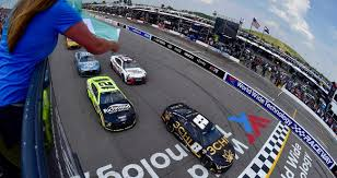 Cars wash out on the exit of turn 4, within arm’s reach of the outside wall before barreling to the finish line to complete the lap on the unique intermediate.