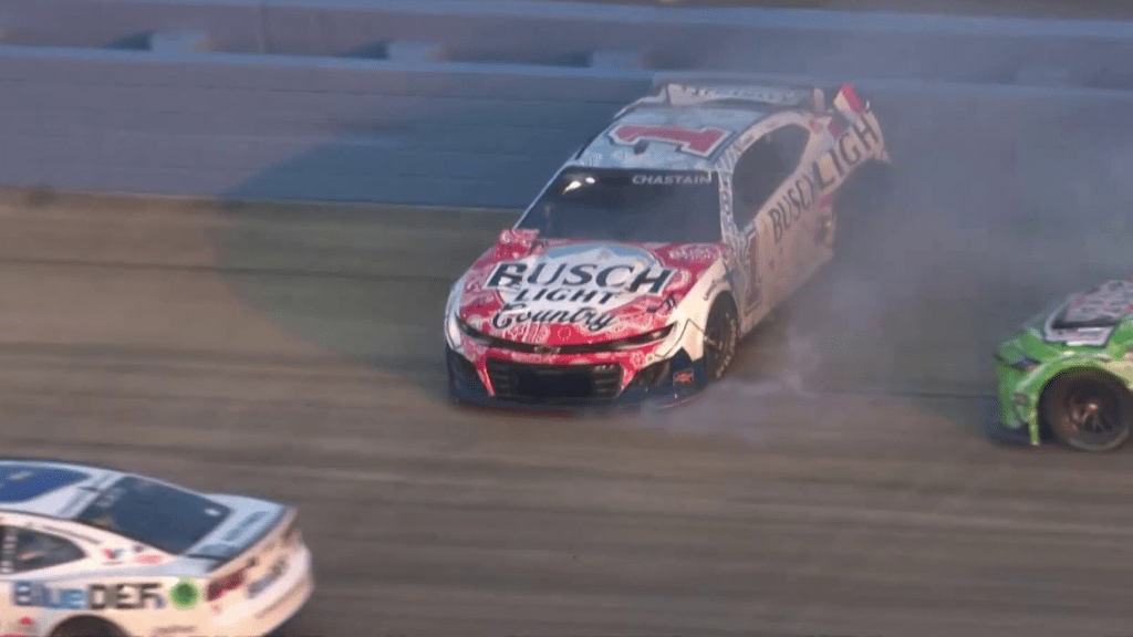 Hamlin controlled the restart with Chastain on the high side. Larson pushed Hamlin’s FedEx Camry all the way through the trioval and into turn 1 until the #5 car clipped the apron, shooting his HendrickCars Camaro back into traffic and punting Chastain into the outside wall.