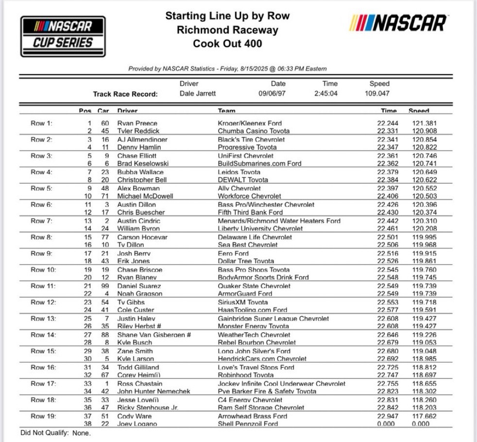 Back to the Cup Series, RFK Racing driver Ryan Preece landed the pole for tonight’s Cook Out 400 with 23XI Racing’s Tyler Reddick joining him on the front row. Here is a look at the starting lineup.